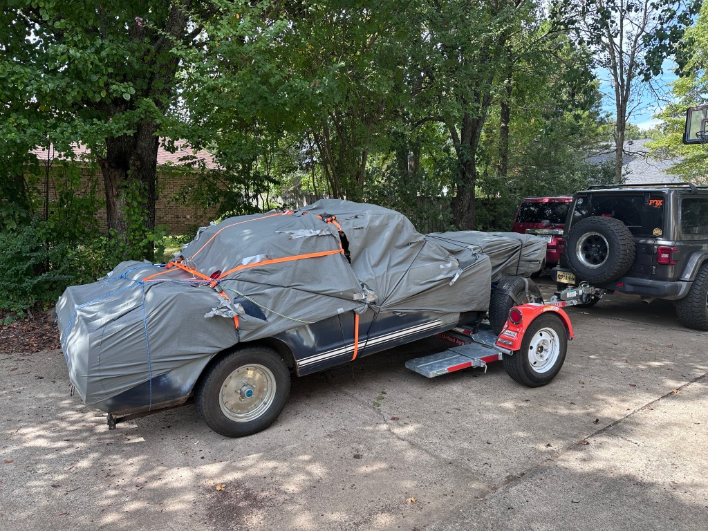 Today, we loaded the Mustang onto the tow-dolly, which I had picked up on the 26th. The car is surprisingly light without the engine and the transmission, but fully loaded with all of the parts we could find. Door liners, random bolts, screws, new carpet, new mufflers, new headers, all original seating, among other various new and removed parts.