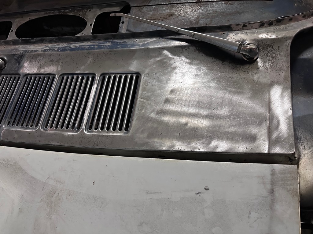 I stripped three areas and found light surface damage on the roof and upper cowl vent. There’s some more aggressive rust around the front windshield — normally hidden under the front fenders — that will need extra treatment and possibly a few reinforcement welds.