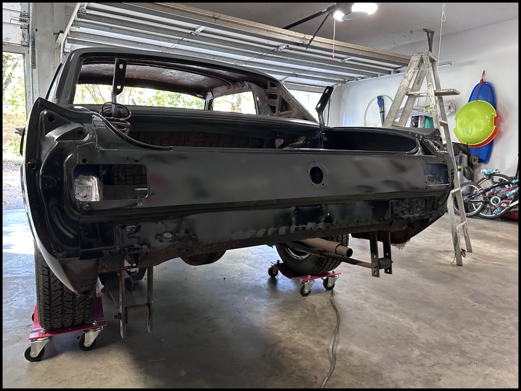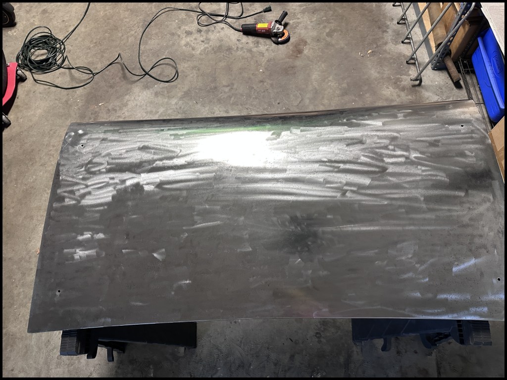The trunk area and rear quarter panels are stripped clean, every flake of old paint and rust chased down and sent packing. The hood cowl is bare metal now too, the kind of clean that only comes from hours bent over with a sander until your shoulders start negotiating with you.